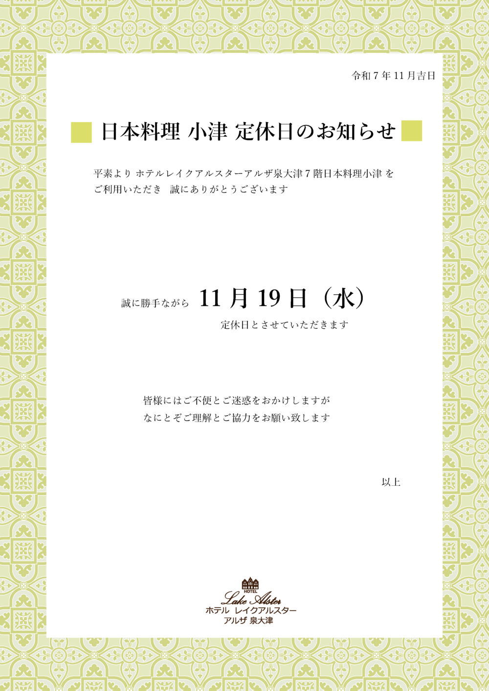 平素よりホテルレイクアルスターアルザ泉大津7階日本料理小津をご利用いただき、誠にありがとうございます。